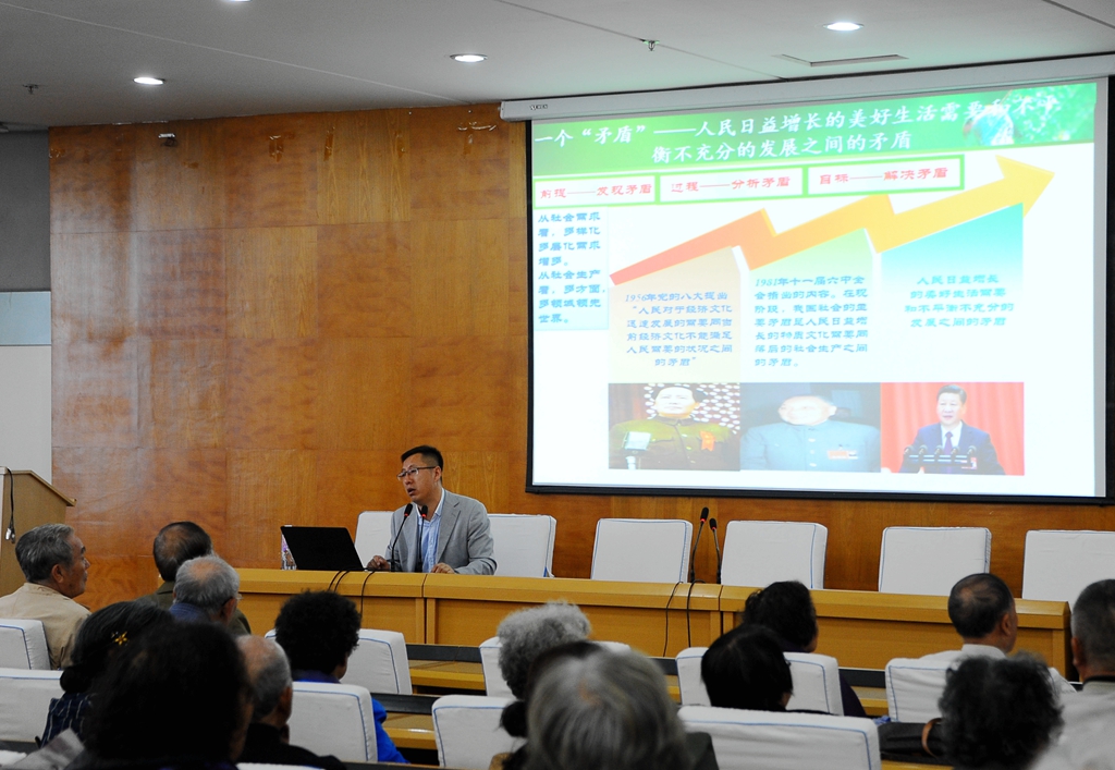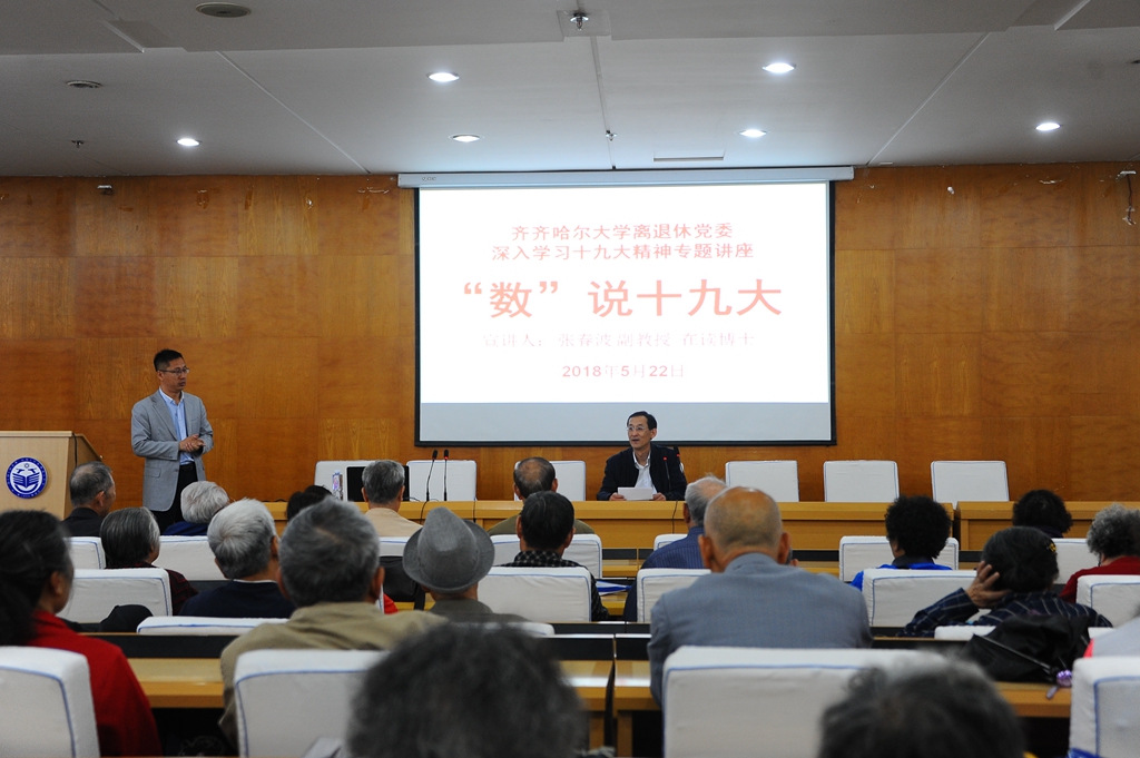 會上,校黨的十九大精神宣講團成員、馬克思主義學院中國近現代史綱要教研部主任、碩士生導師張春波副教授以《“數”說黨的十九大》為題,從新時代、新矛盾——進行偉大斗爭,新理論、新思想——建設偉大工程,新任務、新舉措——推進偉大事業,新使命、新征程——實現偉大夢想等四個方面闡釋了黨的十九大的“新”。他指出,只有進行新的偉大斗爭才能開創新時代,解決新矛盾,只有以馬克思主義中國化最新成果——習近平新時代中國特色社會主義思想為行動指南,才能建設新的偉大工程。