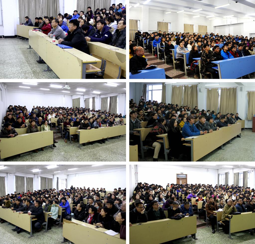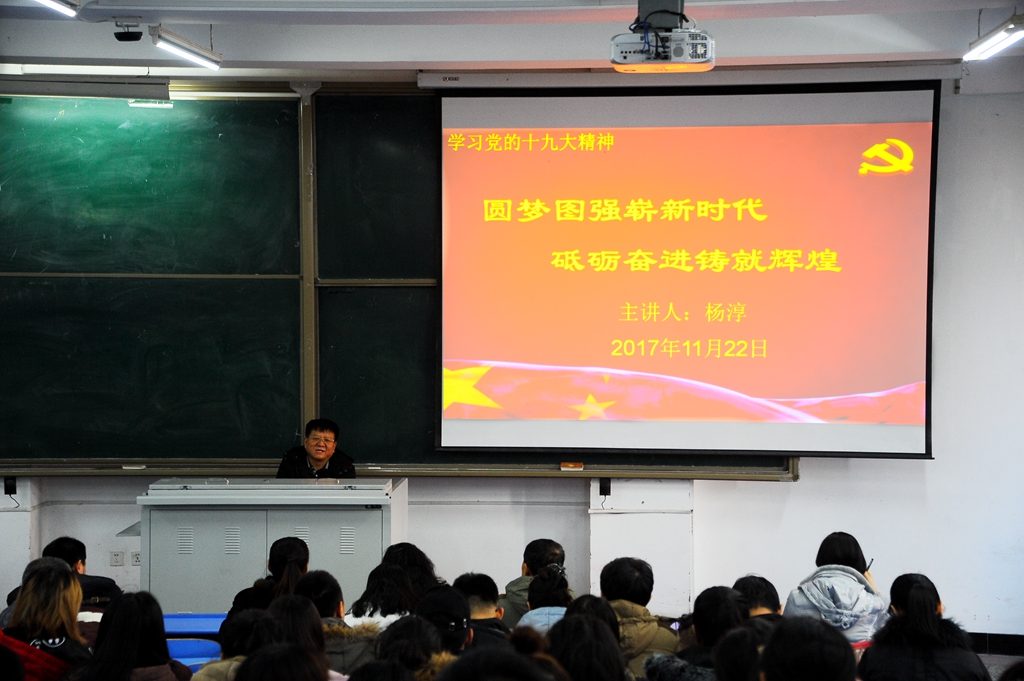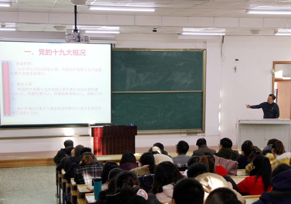 在東區26教第二階梯教室和25教階梯301教室,校黨的十九大精神宣講團成員、哲學與法學學院政治學與行政學專業徐鳳江副教授以《深入推進新時代黨的建設的偉大工程》為題,在講述了新時代全面加強黨的建設的必要性、黨的十八大以來黨的建設的重要手段、措施及成就后,著重解讀了新時代黨的建設的總要求、新時代黨的建設的八項重點任務。他指出,學習領會黨的十九大精神,要緊緊圍繞習近平新時代中國特色社會主義思想這個主線,堅持讀原著、學原文、悟原理,做到學深悟透。通過學習引導全黨自覺維護習近平總書記作為黨中央的核心、全黨的核心地位,維護黨中央權威和集中統一領導。把師生的思想和行動統一到黨的十九大精神上來,把力量凝聚到黨的十九大確定的各項任務上來。外國語學院、音樂與舞蹈學院全體教職工、學生黨員及入黨積極分子參加了宣講活動。