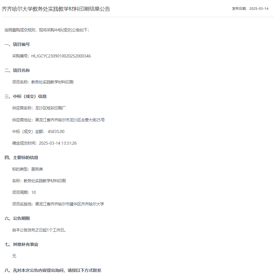 齊齊哈爾大學教務處實踐教學材料印刷結果公告(轉自黑龍江省政府采購網)