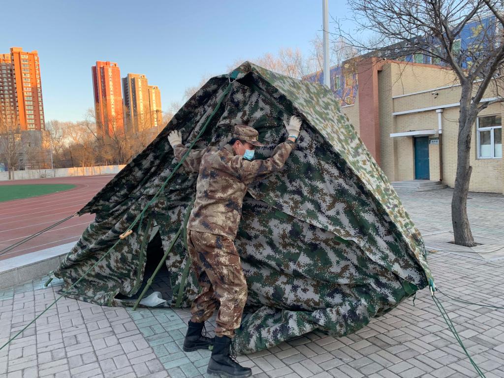 曹宇是齊齊哈爾市建華區(qū)民兵應(yīng)急連的指導(dǎo)員。疫情防控初期,齊齊哈爾市建華區(qū)武裝部就開始支援地方社區(qū)和各路口搭建御寒隔離帳篷。因正處于新年期間,只有曹宇和他的連長兩個人奔波到各處指導(dǎo)并共同完成帳篷搭建工作。僅僅兩個星期,就組織搭建了40多頂帳篷。疫情愈發(fā)嚴重,曹宇還沒來得及歇一歇,就加入了退役軍人事務(wù)局的老兵們自發(fā)組織的退伍老兵突擊隊,帶領(lǐng)大家沖到疫情防控的前線。