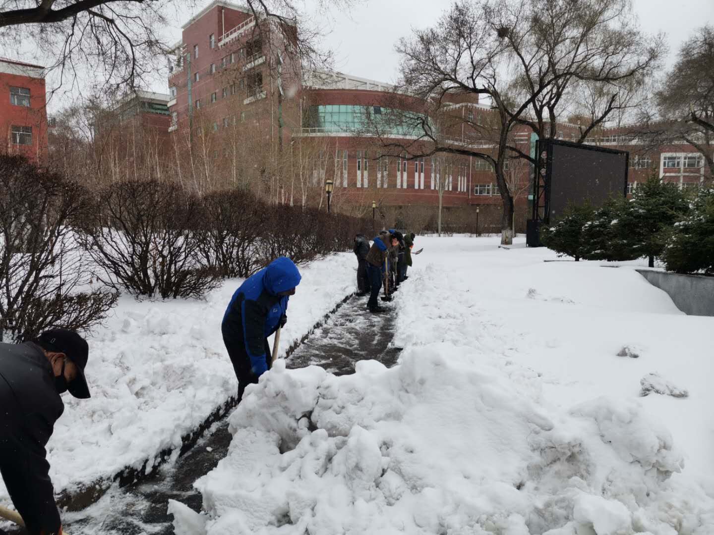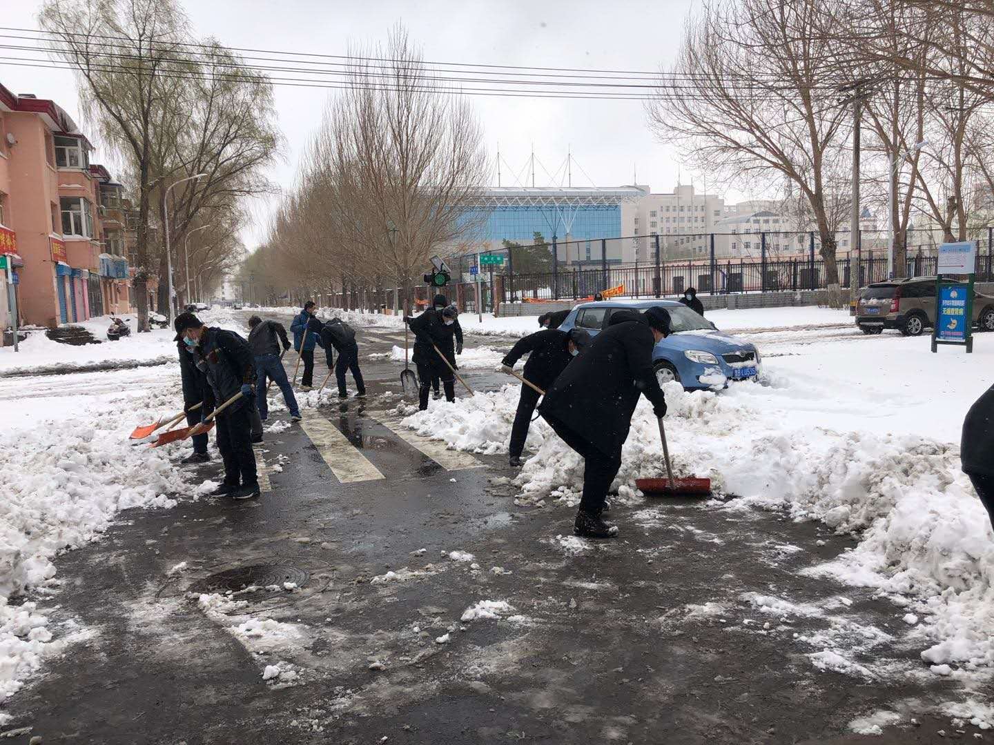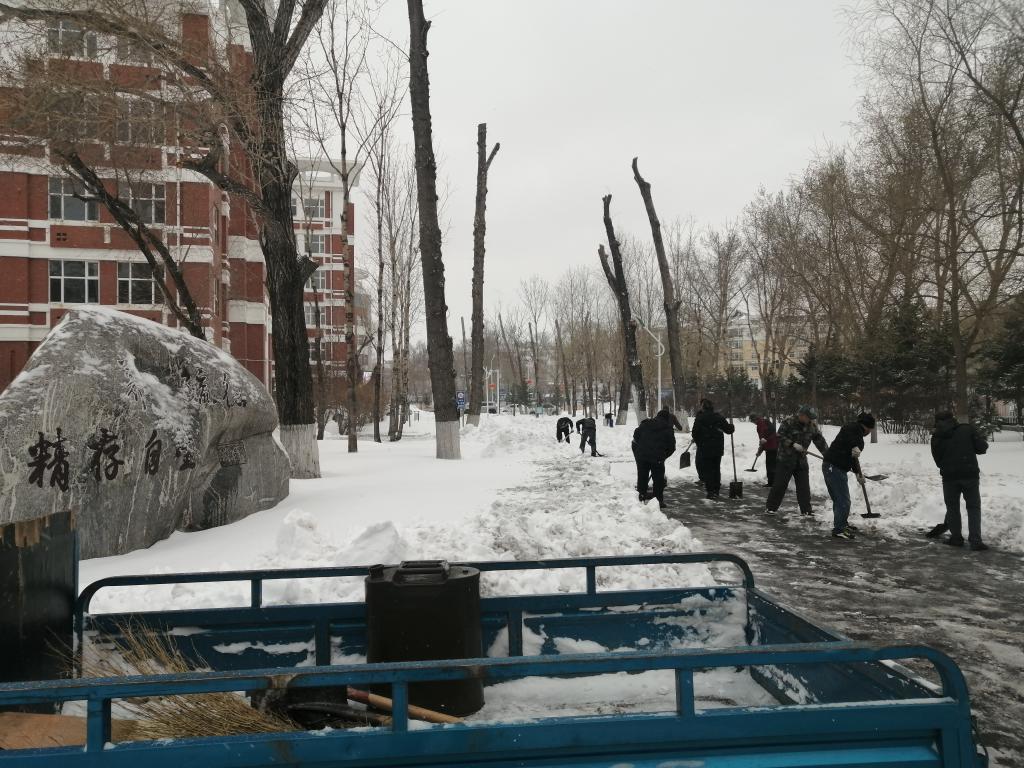 由于初降積雪已經融化結冰,表層積雪已被汽車壓實,氣溫又持續在零下,掃雪工作異常艱難,大家的手和臉都凍得通紅,但這絲毫沒有影響大家的熱情和工作效率,同志們團結協作,發揚吃苦耐勞、頑強拼搏的戰斗精神,以最快的速度將積雪清理干凈,以實際行動表現了真摯的愛校情懷,為教職員工出行創造了便利條件,確保疫情防控期間校園安全有序,展現了齊大人勠力同心、精誠團結的精神風貌。