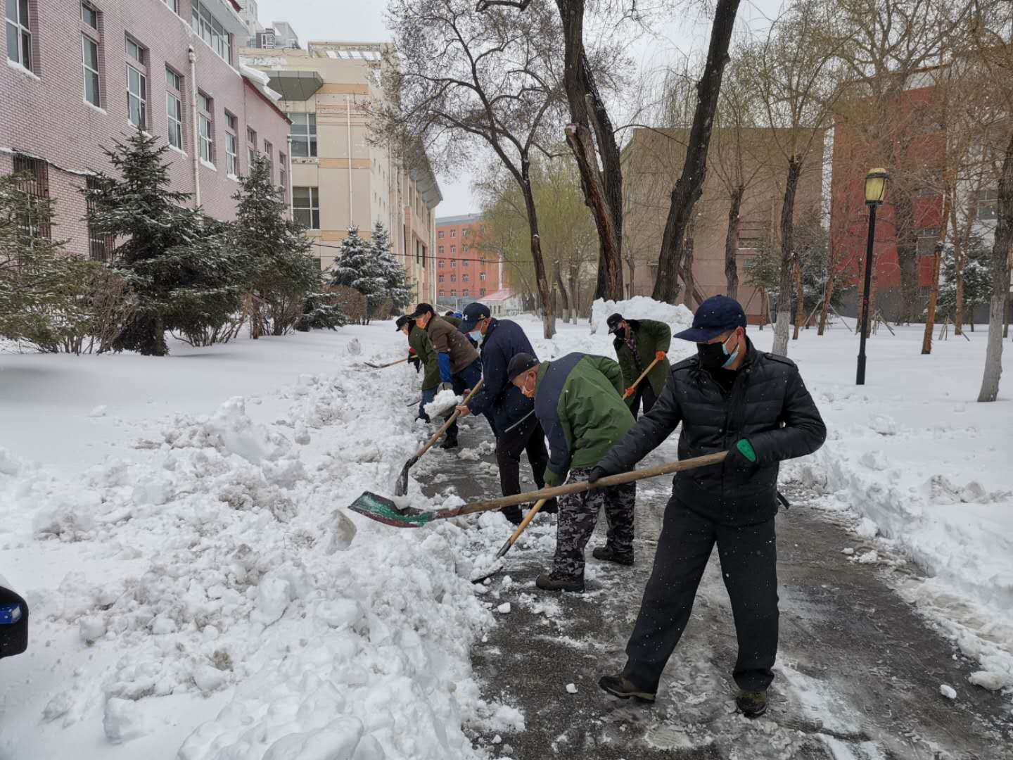 以雪為令,聞雪而動。4月21日上午,降雪量剛剛減少,后勤管理處的工作人員就來到學校中、東、西、西二和林校校區,對積雪點和主要道路開展了大面積的破冰除雪活動。校工會主席陶佰睿帶領武裝部(保衛處)的教工志愿者們一同參加了各校區的清雪活動。