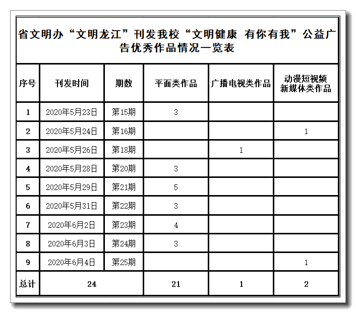 截至近日統計,我校有24項作品入選省文明辦“文明健康 有你有我”公益廣告優秀作品征集活動,涵蓋平面類作品21件、廣播電視類作品1件、動漫短視頻新媒體類作品2件,被黑龍江文明網、“文明龍江”微信公眾號推介9期,向社會廣泛宣傳推廣,產生了積極而廣泛的社會反響,進一步提升了我校的知名度和美譽度,發揮了全國文明單位的示范、輻射和引領作用。