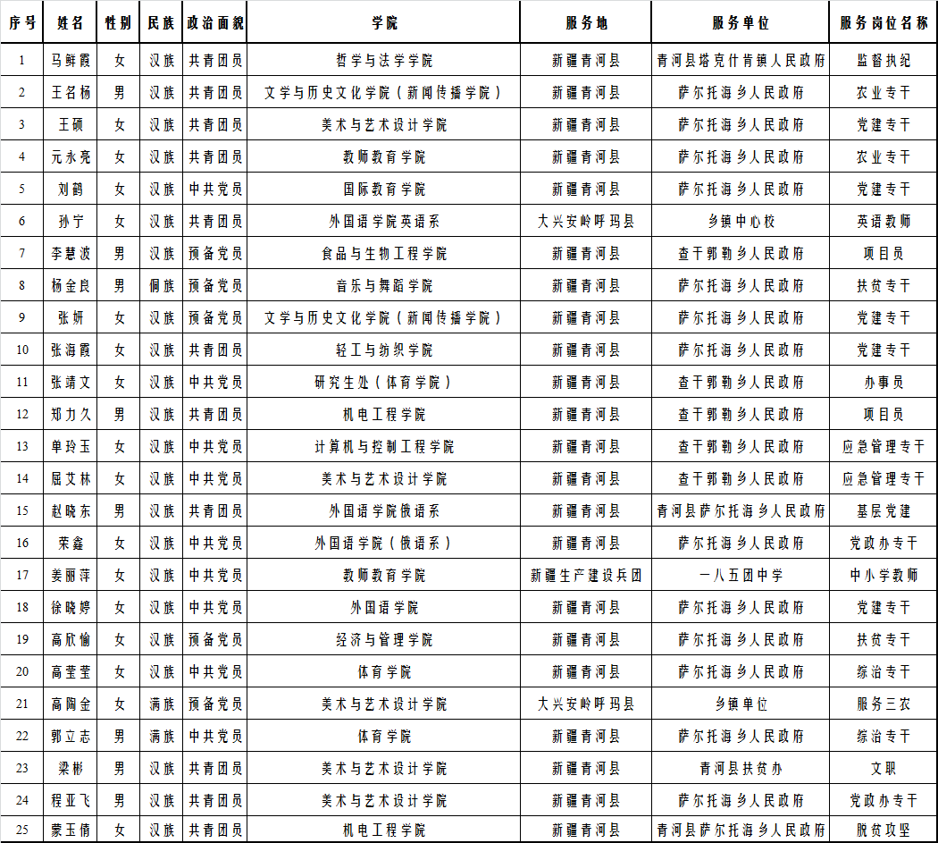 志愿西部行,奉獻新時代。我校2020年大學生志愿服務西部計劃志愿者招募工作自5月份啟動以來,各學院和相關部門廣泛宣傳、協調配合,美麗的環湖大學唱響“到西部去,到基層去,到祖國最需要的地方去”建功立業的青春旋律。按照黑龍江省項目辦工作指示,結合我校的具體情況,經過學校西部計劃項目辦初審、線上限時筆試、體檢等程序綜合考量后。最終25名畢業生在153位報名者中脫穎而出,被正式確定為齊齊哈爾大學2020年大學生志愿服務西部計劃志愿者,他們將分赴黑龍江大興安嶺地區、新疆阿勒泰地區進行基層青年工作、基礎教育、基層社會管理等類型的志愿服務。