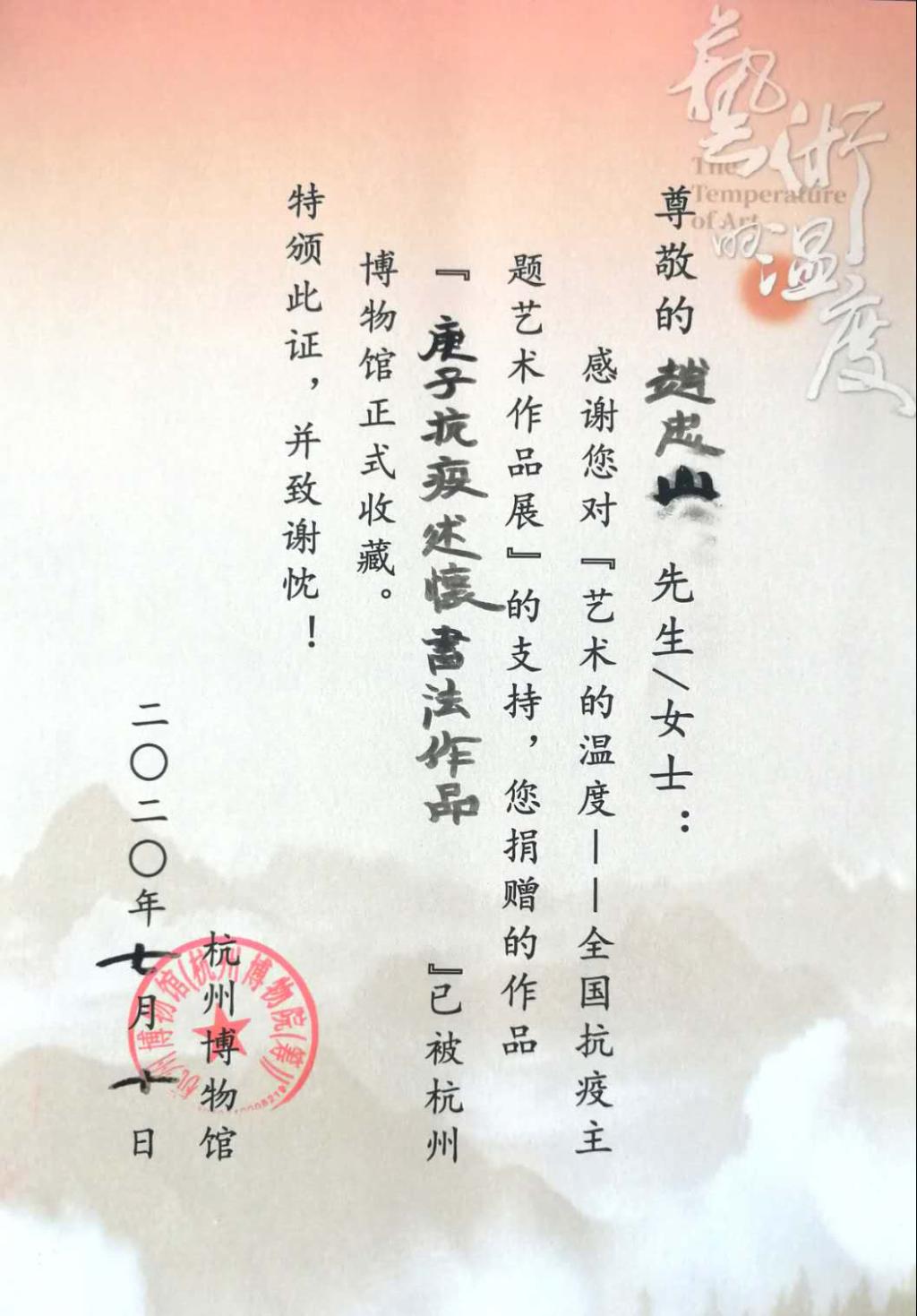 發(fā)布日期:2020-08-22 點(diǎn)擊量:5月10日“藝術(shù)的溫度——全國抗疫主題藝術(shù)作品展”在杭州博物館開展。我校文學(xué)與歷史文化學(xué)院(新聞傳播學(xué)院)趙忠山教授的行書作品《抗疫述懷》成功入展,并被杭州博物館正式收藏。