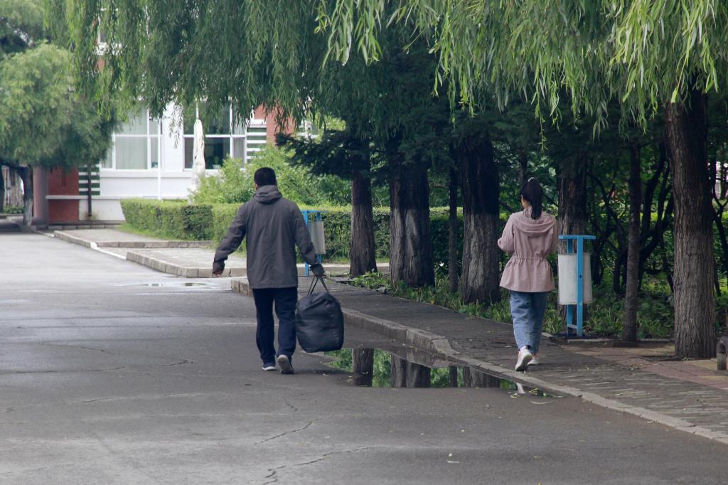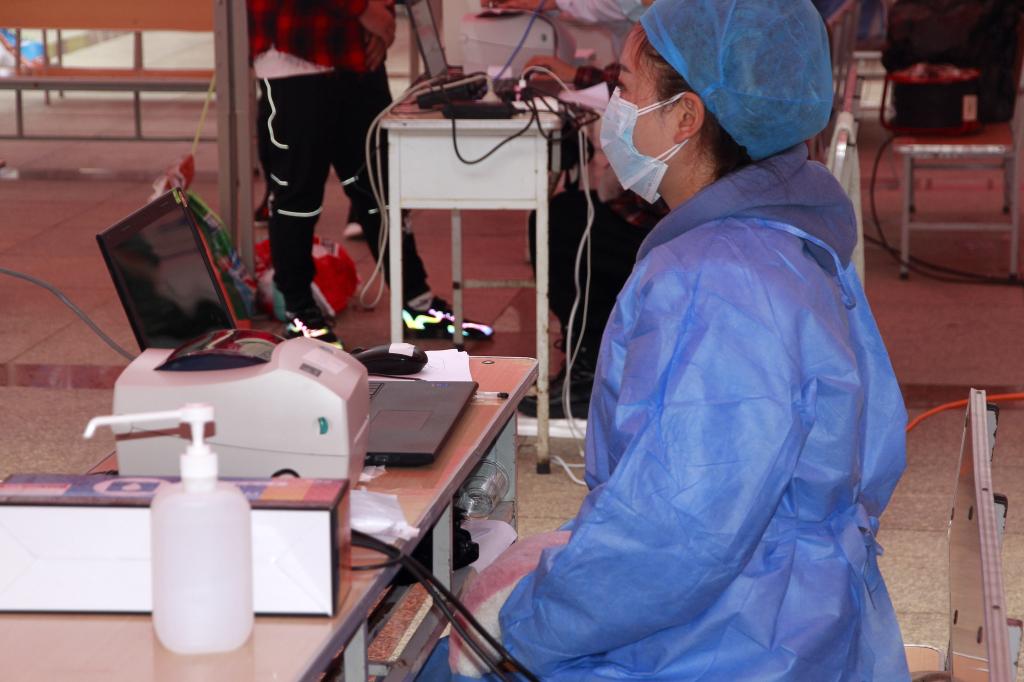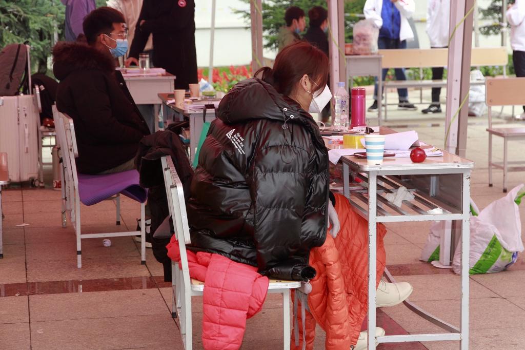 雖然還是初秋,在中區和東區廣場接待點,由于學生錯峰分批陸續前來報道,迎接返校學生工作人員必須一直守候在露天室外。為了防寒保暖,一線的輔導員老師和志愿者們都穿上了厚厚的羽絨服,核酸檢測醫護人員也不得不在換崗時把手縮進熱寶里,羽絨服、熱寶、暖水瓶成了迎接返校學生工作人員的“防寒三件寶”。盡管如此,每當有學生拎著行李箱來報道,迎接他們的都是熱情的笑臉和真誠的問候。