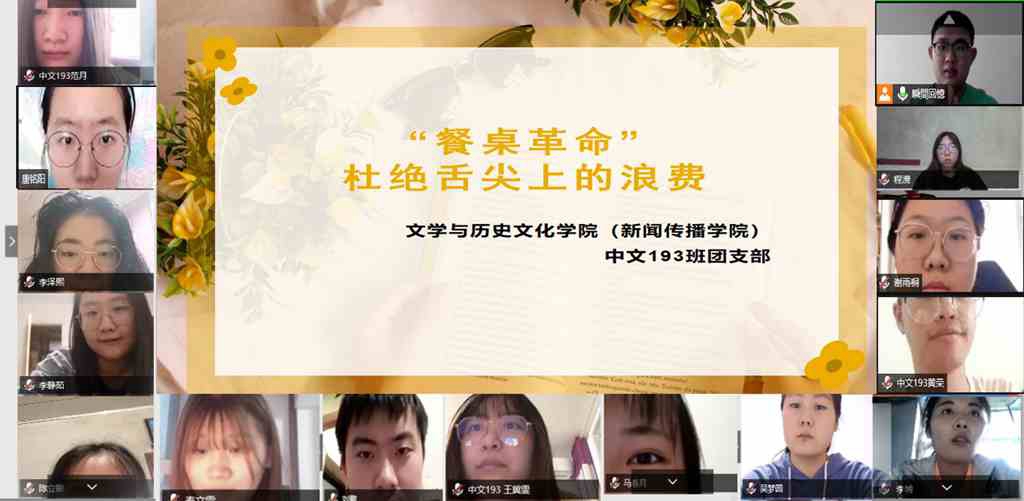 為切實培養學生節約習慣,引導形成“厲行節約、反對浪費”的新風尚,通信與電子工程學院、文學與歷史文化學院、哲學與法學學院充分發揮校園文化的育人功能,組織學生召開了“餐桌革命”線上主題班會。在活動中,大家集思廣益,通過查擺校園中存在的浪費現象,有針對性地提出了解決問題的建議和辦法,使安靜就餐、使用公筷公勺、勤儉節約、健康飲食等理念更加深入人心。