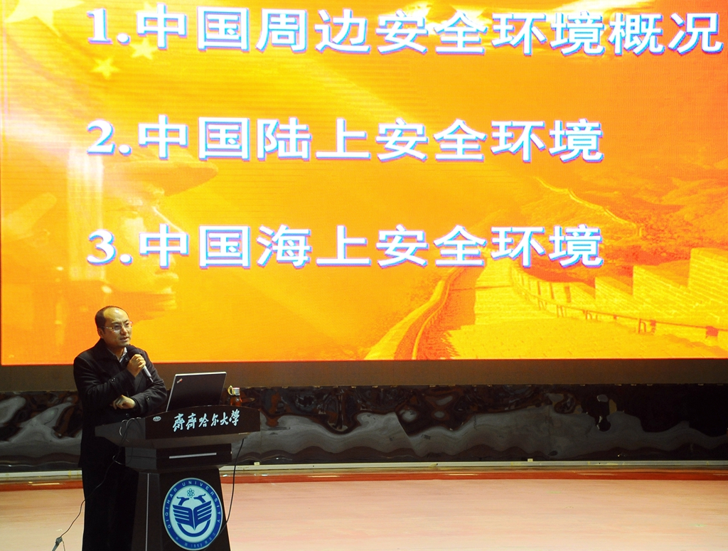 課上,李彥濤老師以《中國周邊安全環境》為題,從軍事角度對中國周邊安全環境概況、中國陸上安全環境及中國海上安全環境進行了深入淺出的解讀,使同學們進一步強化了國防觀念,開拓了軍事視野,提升了軍事理論素養。