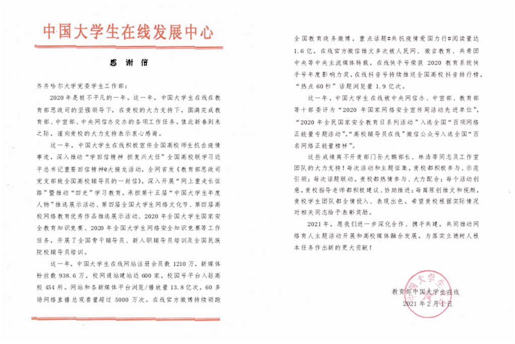 2月1日,教育部中國大學生在線向我校黨委常委、宣傳部長王曉梅和我校學生工作部(學生處)發來感謝信。信中表示,2020年是極不平凡的一年。這一年,中國大學生在線在教育部思政司的堅強領導下,在齊齊哈爾大學的大力支持下,圓滿完成教育部、中宣部、中央網信辦交辦的各項工作任務。值此新春到來之際,謹向齊齊哈爾大學的大力支持表示衷心感謝。