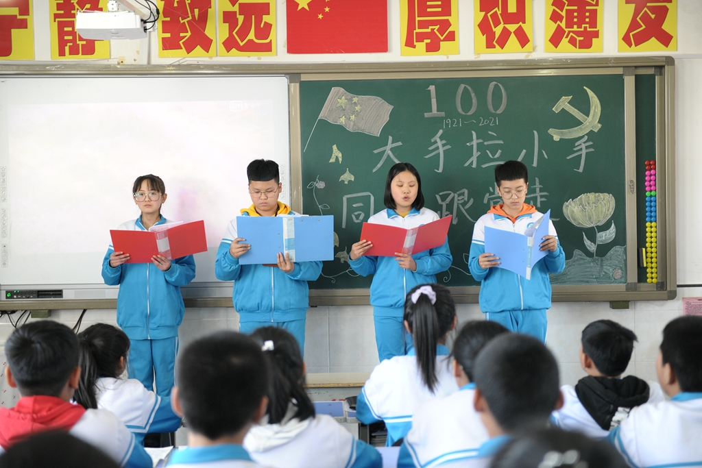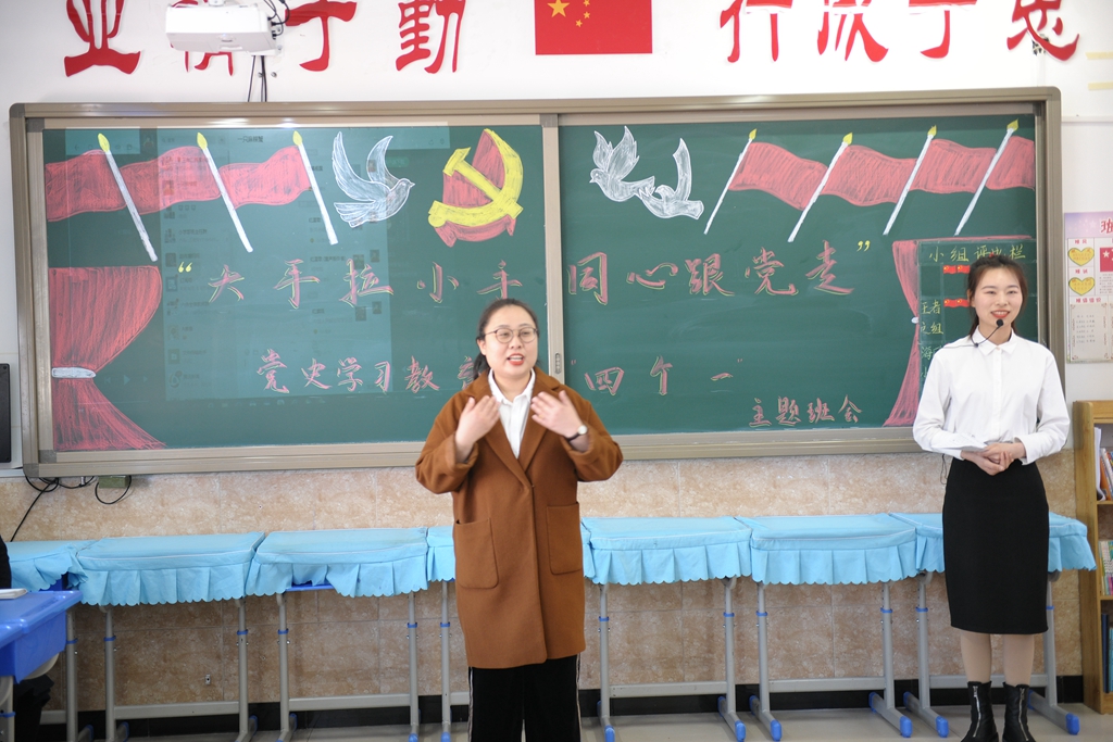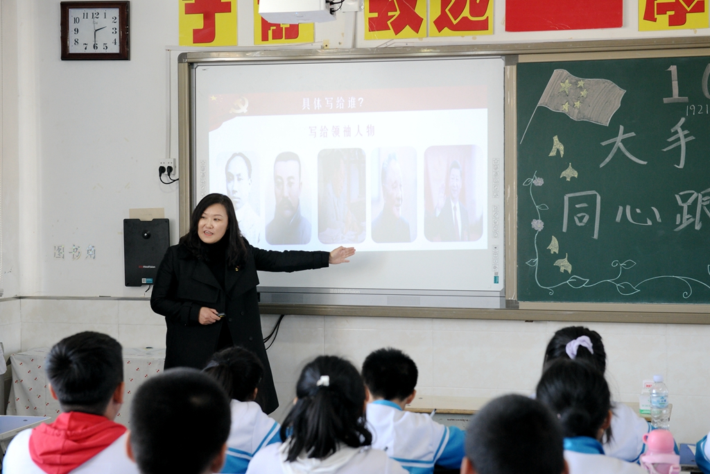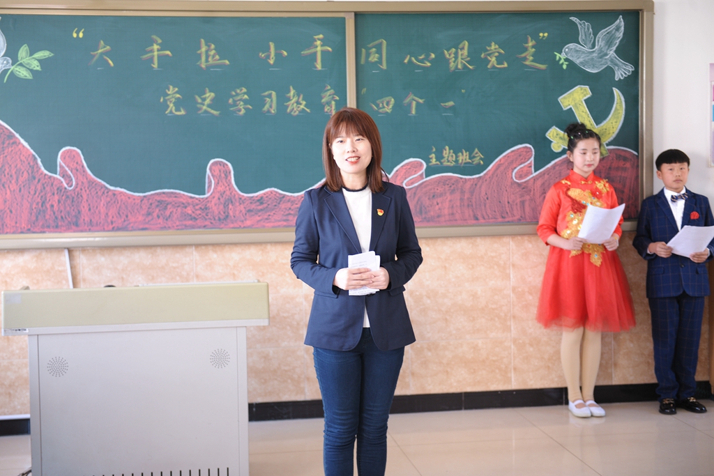 “大手拉小手,同心跟黨走”黨史學習教育“四個一”主題班會以符合中小學生年齡特點與認知經驗為前提,采用寓教于樂的多樣體驗,設計了四個“一”的主題:演唱一支黨的贊歌——各班同學們合唱了《沒有共產黨就沒有新中國》《閃閃紅星》《中國少年先鋒隊隊歌》《少年心中國夢》等歌曲,大家以氣勢磅礴、鏗鏘有力的歌聲抒發對黨、對祖國的熱愛;講述一個黨的故事——青年教師講述了《一生正氣,一門正義夏明翰的故事》《肖永正的故事》《半條被子》《周恩來的故事》等黨史中的經典故事,六合中心校的同學們講述了《王二小的故事》《葉挺的故事》《抗日小英雄海娃的故事》《過年》等黨史故事,師生們在一個個黨史故事中一起追尋紅色記憶,感受中國共產黨成長壯大的曲折歷程;朗誦一首黨的詩歌——青年教師和同學們一起朗誦了經典詩歌《親愛的祖國》《百年輝煌》《黨的贊歌》《黨啊,我親愛的黨!》,將紅色種子厚植在學生心田,讓紅色基因在這里傳承發揚;寫一封給黨的書信——在青年教師的引導下,全體學生以“紙”為媒,給黨寫了一封書信,對象有的是英雄烈士,有的是領袖人物,部分同學還朗讀了書信,表達了同學們對黨的熱愛和對美好未來的憧憬之情。