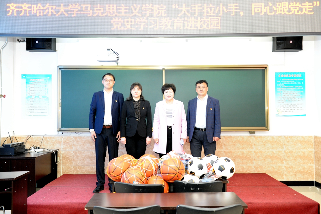 主題班會召開前,青年教師讀書會的教師們向六合中心學校的同學們捐贈了球、跳繩等文化活動用品,向同學們傳達了來自齊齊哈爾大學馬克思主義學院的各位青年教師的關心和溫暖。