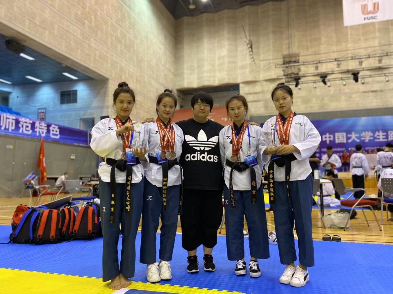 學校對此次大賽高度重視,由體育學院修月老師帶領9名學生參加此次國家級別賽事。經過五天激烈的賽場角逐,取得了1金、2銀、6銅的好成績。我校學生李揚獲得男子個人品勢金牌;楊子琪、馬玉齊兩名同學榮獲銀牌;王翹楚、蔣雪、單麗媛三名同學榮獲女子團體品勢銅牌;張元文、劉壯、石雋滔三名同學榮獲男子個人、團體銅牌;跆拳道舞獲得團體項目銅牌。并取得了高水平組團體總分第四的歷史性突破成績。