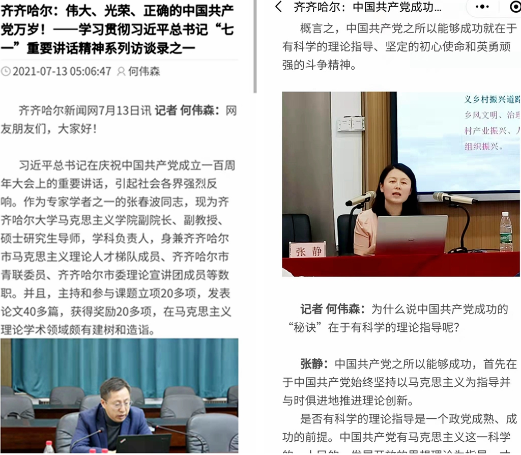 習近平總書記在慶祝中國共產黨成立一百周年大會上的重要講話,全面回顧了我們黨100年來團結帶領全國各族人民不懈奮斗走過的光輝歷程和作出的偉大歷史貢獻。使廣大人民置身于蕩氣回腸的奮斗過程,感慨所取得震古爍今的偉大成果。這是一份梳理黨向歷史和人民交出滿意答卷的“總結單”,是新時代立足中國實際不斷開創馬克思主義新境界的“指南針”,是共產黨人理想信念精神之鈣的“鑒定書”。我校馬克思主義學院與齊齊哈爾新聞網合作,以專欄形式推出了10篇學習貫徹習近平總書記“七一”重要講話精神系列訪談,累計閱讀達萬次。