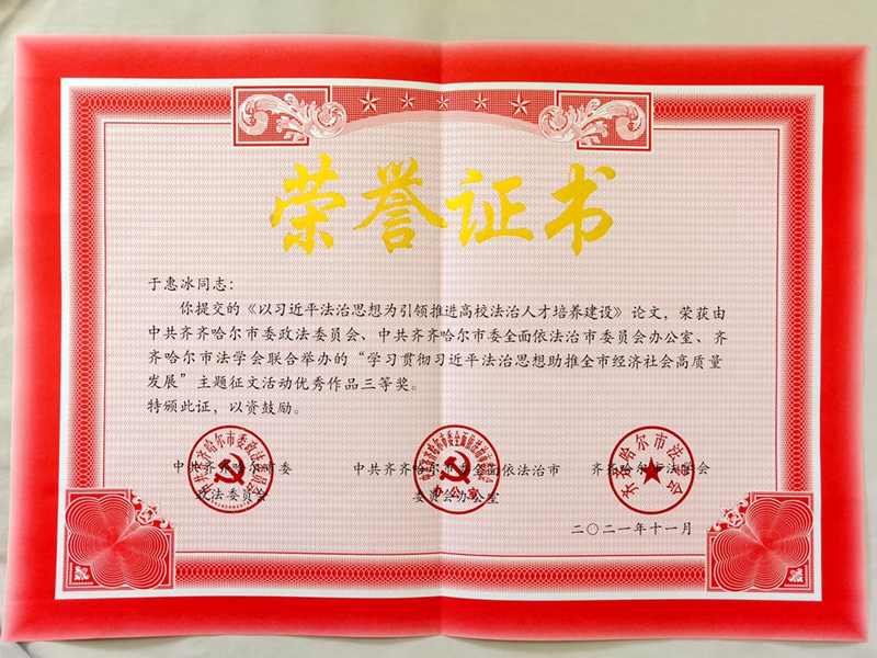 學思踐悟,細照篤行。學校黨委高度重視學習宣傳貫徹習近平法治思想。習近平法治思想是馬克思主義法治理論同中國實際相結合的最新成果,是21世紀馬克思主義法治思想,是習近平新時代中國特色社會主義思想的重要組成部分,是全面依法治國的根本遵循和行動指南,深刻回答了為什么要全面依法治國、怎樣全面依法治國這個重大時代課題。校、院兩級黨委將習近平法治思想的學習納入黨委理論學習中心組學習計劃、納入教職工政治理論學習計劃,組織廣大師生員工充分利用“學習強國”“黑龍江教育干部網(wǎng)絡學院”等網(wǎng)絡平臺等多種形式,學深悟透習近平法治思想,深刻領會其重大意義、精神實質、實踐要求,學懂弄通《法治中國建設規(guī)劃(2020—2025年)》把習近平法治思想融入教學體系。自2021年9月開始,將“習近平法治思想概論”納入了2021級法學專業(yè)基礎必修課,做好進教材、進課堂、進頭腦工作。加強習近平法治思想的理論研究和闡釋,發(fā)表《論習近平法治思想的實踐論核心內涵》等論文;在齊齊哈爾市“學習貫徹習近平法治思想”主題征文活動中,我校師生榮獲一等獎、三等獎各1篇。推動習近平法治思想入腦入心、走深走實,不斷增強法治意識,提高法治能力水平。