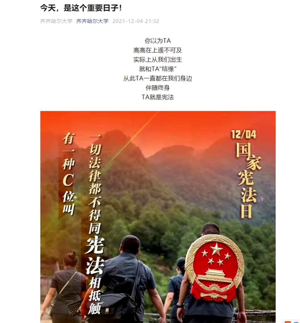 在第八個國家憲法日,教育部舉辦了教育系統(tǒng)的“憲法晨讀”活動,各單位各部門積極組織學生參與,一起誦讀憲法部分條款,觀看“學憲法 講憲法活動全國總決賽頒布獲獎名單及部分優(yōu)秀學生的現(xiàn)場展演。共同學習憲法知識,體會憲法溫度,感受憲法力量。