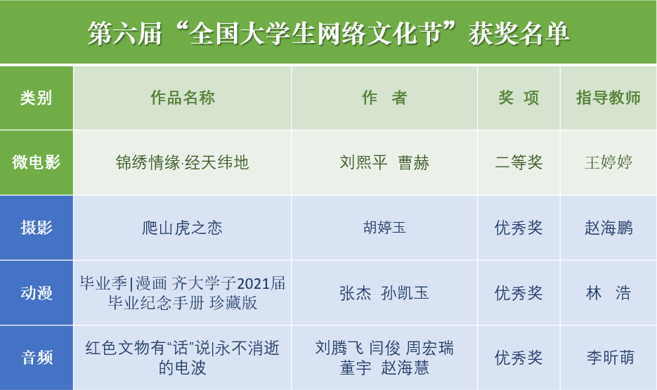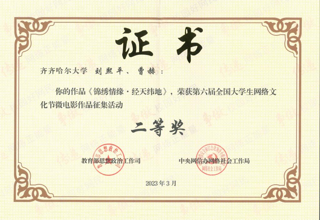 近日,由教育部思想政治工作司、中央網(wǎng)信辦網(wǎng)絡(luò)社會(huì)工作局主辦的第六屆“全國大學(xué)生網(wǎng)絡(luò)文化節(jié)”公布了遴選結(jié)果。我校斬獲全國二等獎(jiǎng)1項(xiàng),全國優(yōu)秀獎(jiǎng)3項(xiàng)。其中,文學(xué)與歷史文化學(xué)院(新聞傳播學(xué)院)王婷婷老師指導(dǎo),劉熙平、曹赫同學(xué)創(chuàng)作的《錦繡情緣·經(jīng)天緯地》榮獲微電影類作品二等獎(jiǎng);齊齊哈爾大學(xué)廣播電臺(tái)胡婷玉同學(xué)的作品《爬山虎之戀》榮獲攝影類作品優(yōu)秀獎(jiǎng);易班工作室張杰、孫凱玉創(chuàng)作的《畢業(yè)季|漫畫 齊大學(xué)子2021屆畢業(yè)紀(jì)念手冊(cè) 珍藏版》榮獲動(dòng)漫類作品優(yōu)秀獎(jiǎng);齊齊哈爾大學(xué)廣播電臺(tái)劉騰飛、閆俊、周宏瑞、董宇、趙海慧同學(xué)的作品《紅色文物有“話”說|永不消逝的電波》榮獲音頻類作品優(yōu)秀獎(jiǎng)。