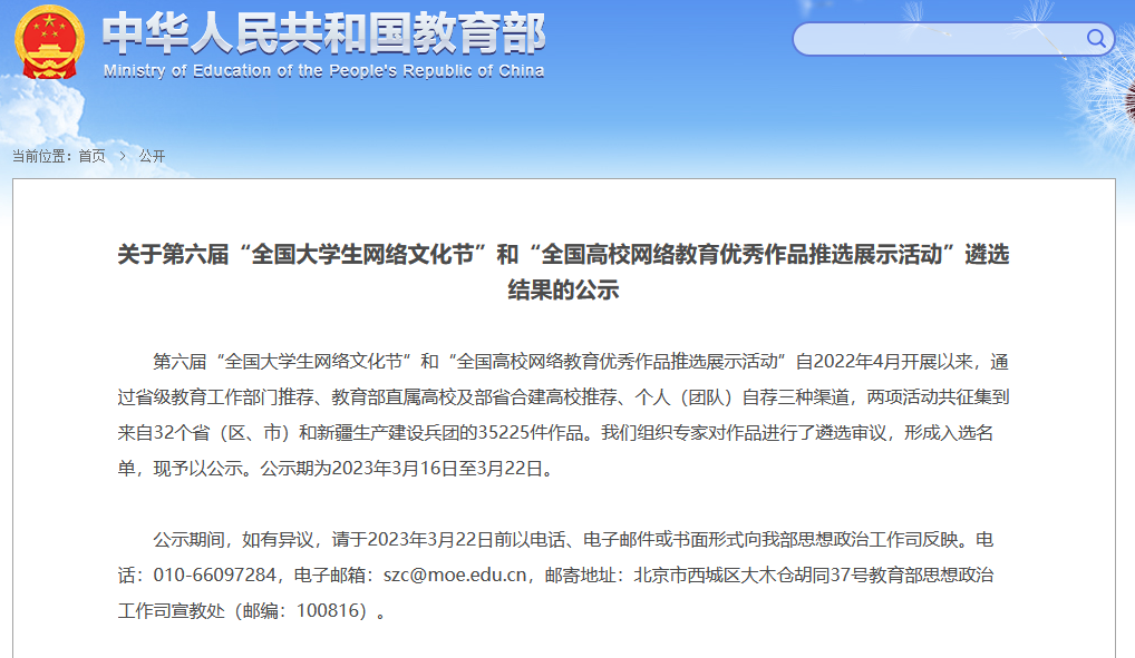 據(jù)悉,作為全國高校網(wǎng)絡(luò)思政領(lǐng)域最高級(jí)別競(jìng)賽之一,第六屆“全國大學(xué)生網(wǎng)絡(luò)文化節(jié)”和“全國高校網(wǎng)絡(luò)教育優(yōu)秀作品推選展示活動(dòng)” 兩項(xiàng)活動(dòng)共征集到來自32個(gè)省(區(qū)、市)和新疆生產(chǎn)建設(shè)兵團(tuán)的35225件作品。網(wǎng)絡(luò)文化節(jié)征集作品類型包括微視頻、微電影、動(dòng)漫、攝影、網(wǎng)文、公益廣告、音頻、校園歌曲、其他類網(wǎng)絡(luò)創(chuàng)新作品等9類。網(wǎng)絡(luò)教育優(yōu)秀作品包括優(yōu)秀網(wǎng)絡(luò)文章、優(yōu)秀工作案例、優(yōu)秀微課、優(yōu)秀新媒體作品等4類。此次,我校共推薦九類134個(gè)作品參賽。