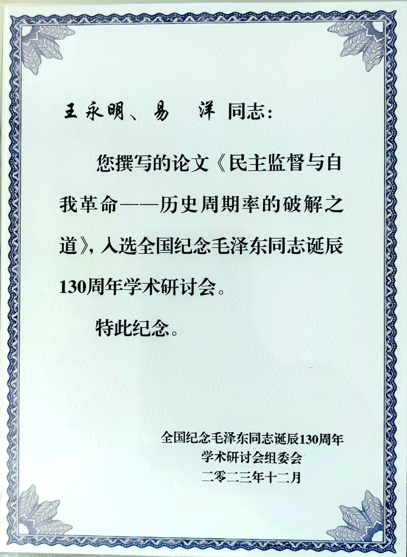 為紀念毛澤東同志誕辰130周年,深切緬懷毛澤東同志的豐功偉績,傳承弘揚毛澤東同志的光輝思想和崇高精神風范,根據中央有關文件精神,12月26日至28日,由中央宣傳部、中央黨校(國家行政學院)、中央黨史和文獻研究院、教育部、中國社科院和中央軍委政治工作部聯合舉辦的“全國紀念毛澤東同志誕辰130周年學術研討會”在北京舉行,中共中央政治局常委、中央書記處書記蔡奇出席開幕式并講話。我校馬克思主義學院王永明教授、思想政治教育專業碩士研究生易洋同學撰寫的論文《民主監督與自我革命——歷史周期率的破解之道》成功入選全國紀念毛澤東同志誕辰130周年學術研討會,易洋同學作為入會論文作者應邀參加了本次高水平學術研討會。