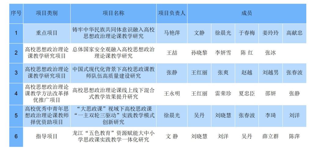 日前,黑龍江省教育廳公布了2023年度黑龍江省高等教育教學改革項目思想政治理論課教學改革研究專項研究立項結果通知,我校馬克思主義學院共有6項課題獲批立項。