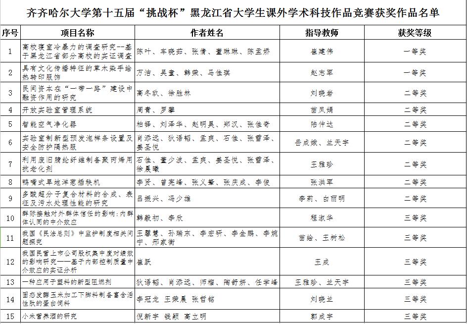近日,由團省委、省教育廳、省科技廳、省社科院、省學聯聯合主辦的第十五屆“挑戰杯”黑龍江省大學生課外學術科技作品競賽決賽評審工作圓滿結束,我校有15項作品獲獎,學校獲得優秀組織獎。
