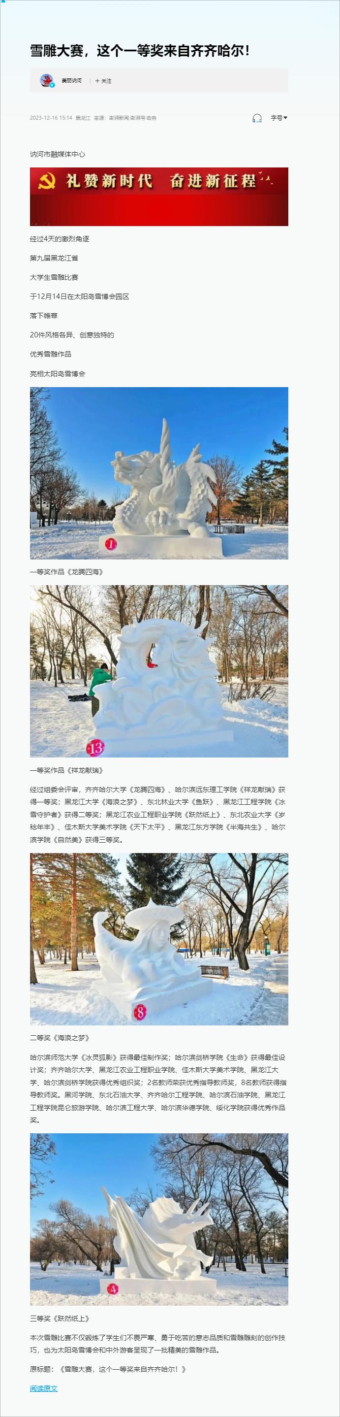 下一條:【鶴城發(fā)布】雪雕大賽,這個一等獎來自齊齊哈爾!