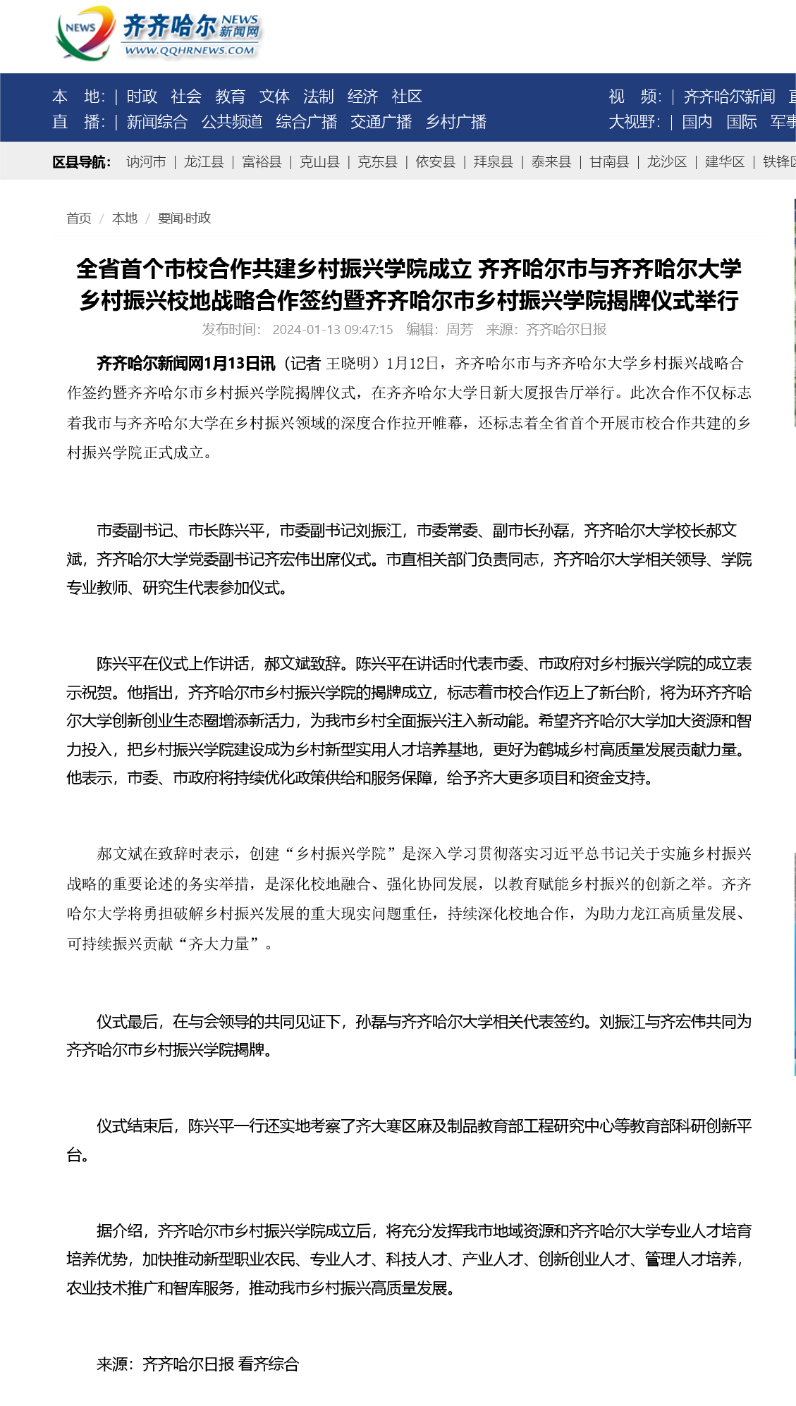 【齊齊哈爾新聞網】全省首個市校合作共建鄉村振興學院成立 齊齊哈爾市與齊齊哈爾大學鄉村振興校地戰略合作簽約暨齊齊哈爾市鄉村振興學院揭牌儀式舉行
