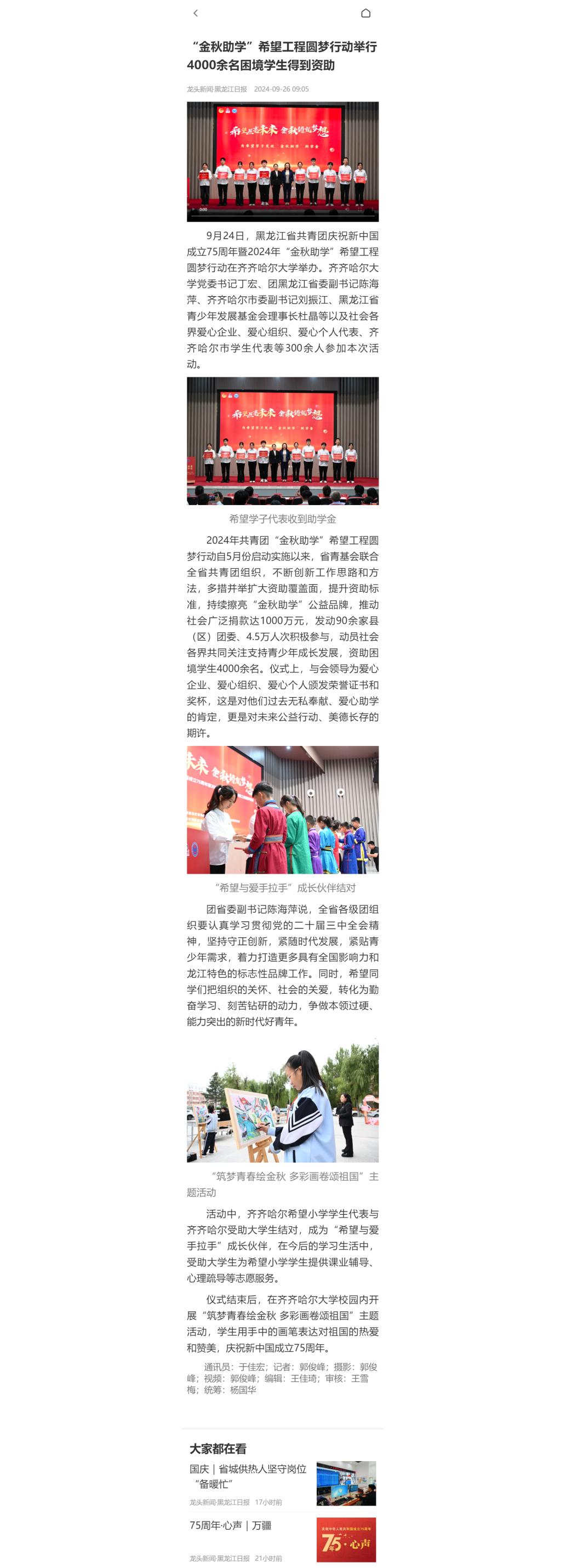 【龍頭新聞·黑龍江日報】“金秋助學”希望工程圓夢行動舉行 4000余名困境學生得到資助