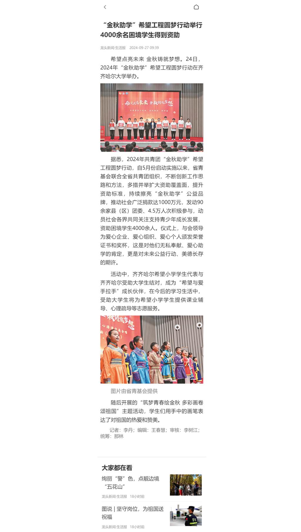 【龍頭新聞·生活報】“金秋助學”希望工程圓夢行動舉行 4000余名困境學生得到資助