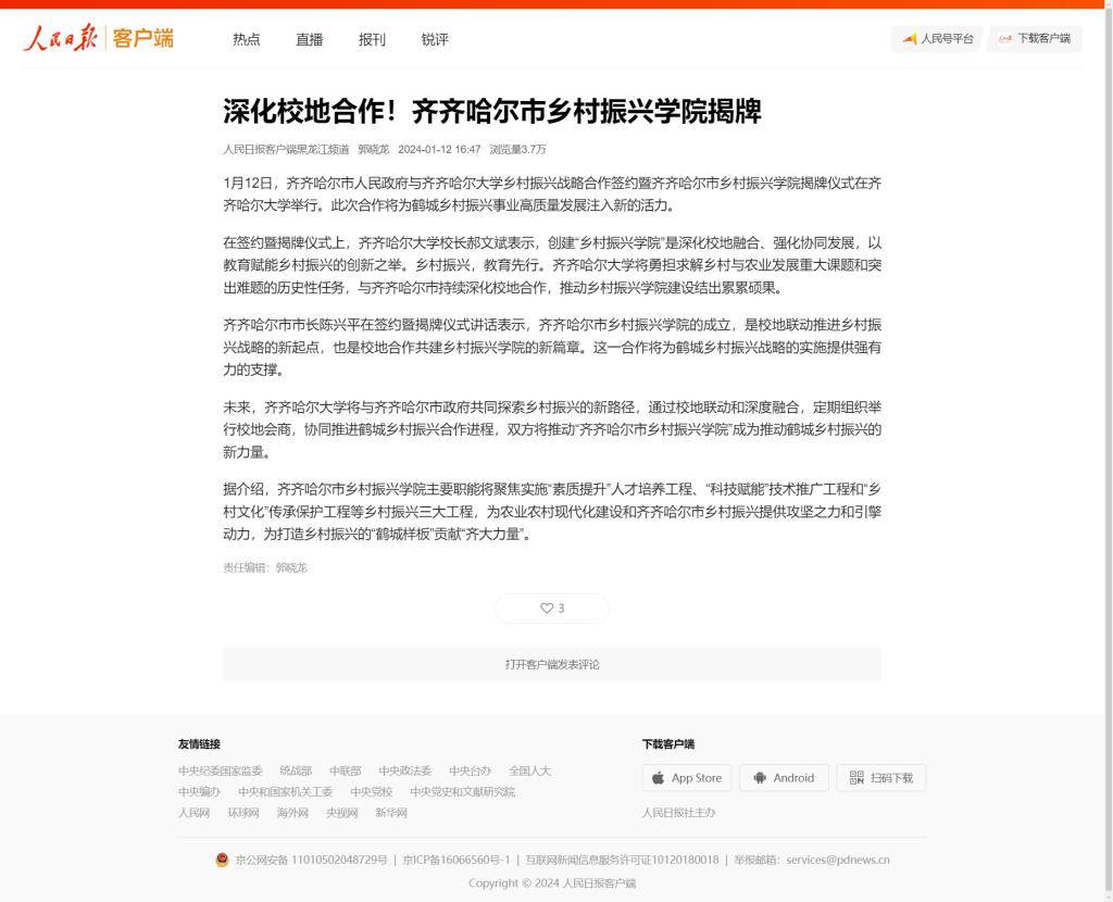 【人民日報】深化校地合作!齊齊哈爾市鄉村振興學院揭牌