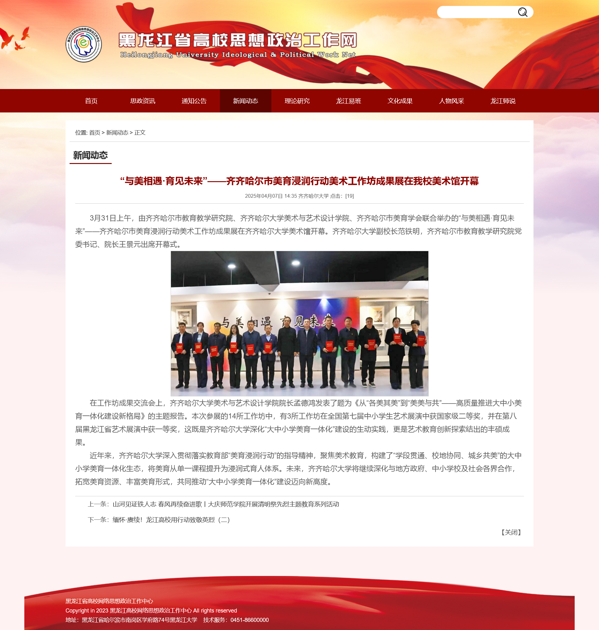 【黑龍江省高校思想政治工作網(wǎng)】“與美相遇·育見未來”——齊齊哈爾市美育浸潤行動(dòng)美術(shù)工作坊成果展在我校美術(shù)館開幕